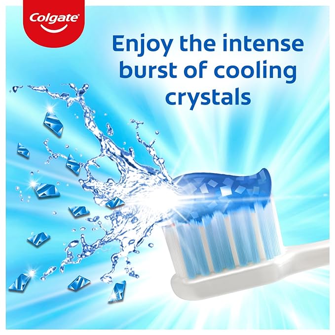 - This blue gel toothpaste contains unique cooling crystal that dissolve completely as you brush. Colgate Maxfresh gives you an icy wave of minty coolness and an intense burst of freshness