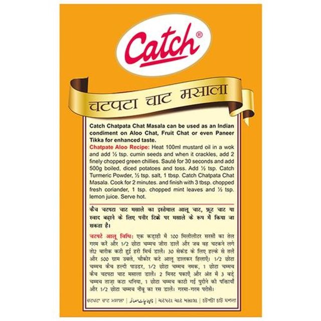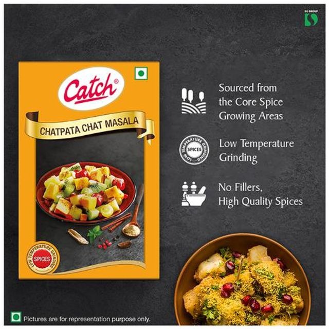 About this item Catch Chatpata Chat Masala is a staple masala in Indian kitchen. Chat masala is an all-in-one seasoning. Compliments Salads, Sandwiches, Fresh fruits, Finger chips, Snacks, Soft drinks, Sprouted beans. Can be used in gravies and curries to add tanginess. Net weight: 100 g