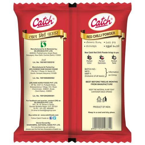 About this item SOURCED FROM THE BEST FARMS: Catch Red Chilli Powder is sourced from the best farms in prime spice-growing locations like Guntur (Andhra Pradesh) and Byadigi (Karnataka) to ensure the highest quality of spice. PACKED HYGIENICALLY: Catch Spices are packed using state of the art equipment ensuring minimal human contact. LTG TECHNOLOGY: Catch Red Chilli Powder is prepared using Low Temperature Grinding Technology. LTG ensures better retention of natural oils and flavours in spices. MATCHLESS FLAVOURS: Catch Red Chilli Powder is abundantly used in regular and exotic dishes. It adds texture, colour, spice, and punch to Indian food while enhancing the taste, flavour, and look of the dishes. ALSO TRY: Catch Turmeric Powder, Catch Yellow Chilli Powder, Catch Kasuri Methi, Catch Kashmiri Mirch Powder & more. item_form:Powder ingredients:chili peppers and blended with other spices including cumin, onion, garlic powder, and sometimes salt. allergen_information:allergen_free