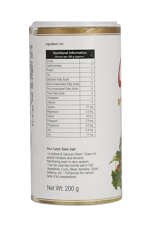 About this item It is iodized & vaccume dried enhances the natural taste of all preparations. Catch Table Salt Sprinkler is an essential dinner table condiment. A quality product packed with minimum human interference. The unique HIPS container keeps the salt inside dry. Salt is widely used as an additional seasoning agent as it magnifies the taste of all the other spices. Catch Table Salt does not absorb moisture & remains free-flowing even in rainy season. Net weight: 200 g - Easy to Store - Tabel top dispenser