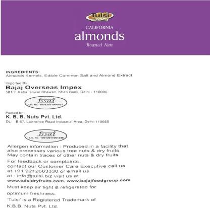Tulsi California Almonds Roasted Nuts Lightly Salted 200GM